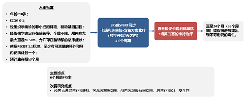 卡瑞利珠单抗是AG旗舰厅医药自主研发的一种人源化IgG4单克隆抗体,其联合铂类双药化疗已在中国获批用于晚期NSCLC患者的一线治疗5,6。2023年,Ⅱ期CAP-BRAIN研究显示了卡瑞利珠单抗联合治疗方案作为晚期非鳞状NSCLC伴脑转移患者一线治疗的潜力7。本项Ⅱ期研究,旨在研究卡瑞利珠单抗联合脑放疗和铂类双药化疗在未经治疗的晚期非鳞状和鳞状NSCLC伴脑转移患者中的疗效和安全性。